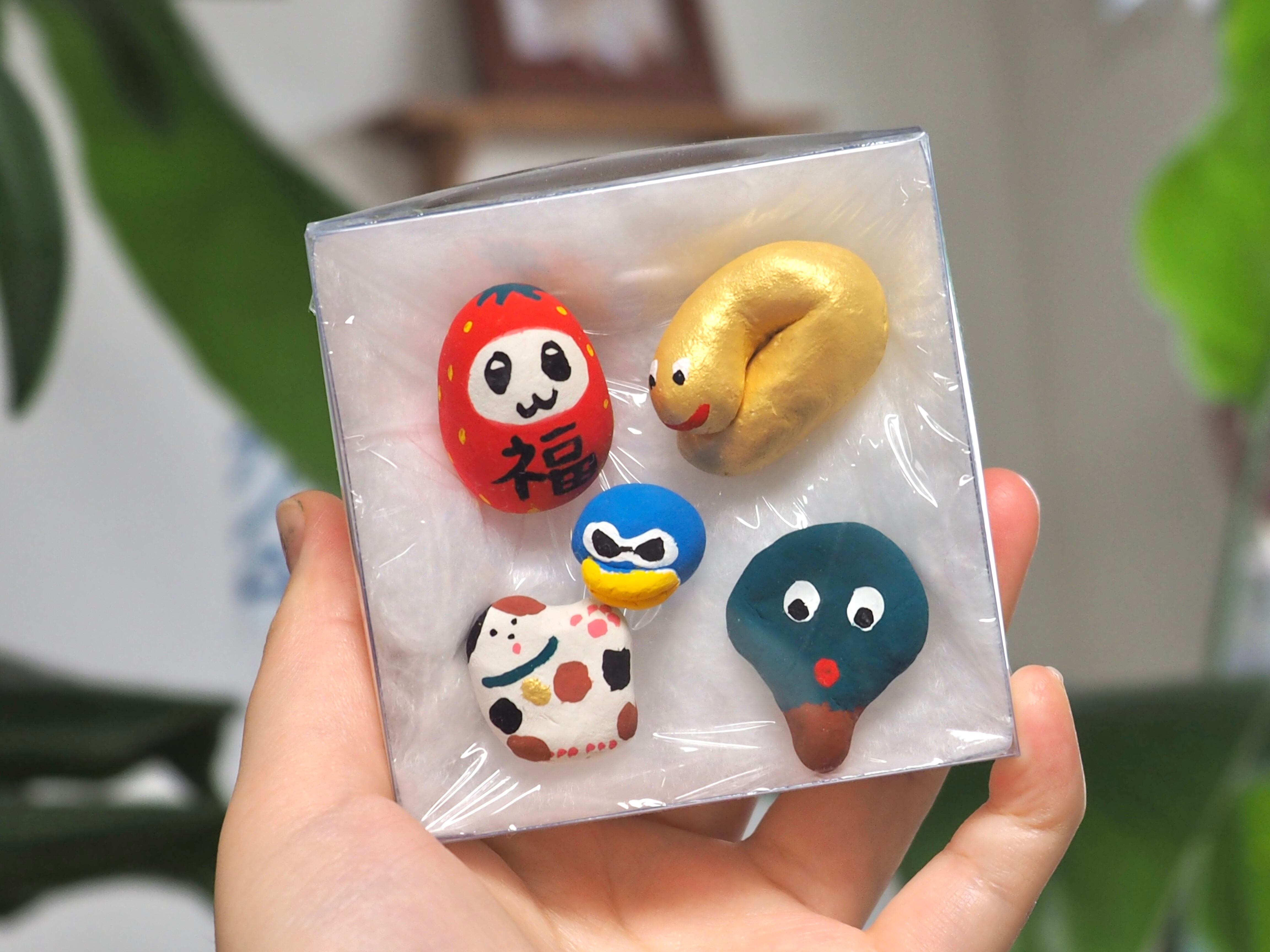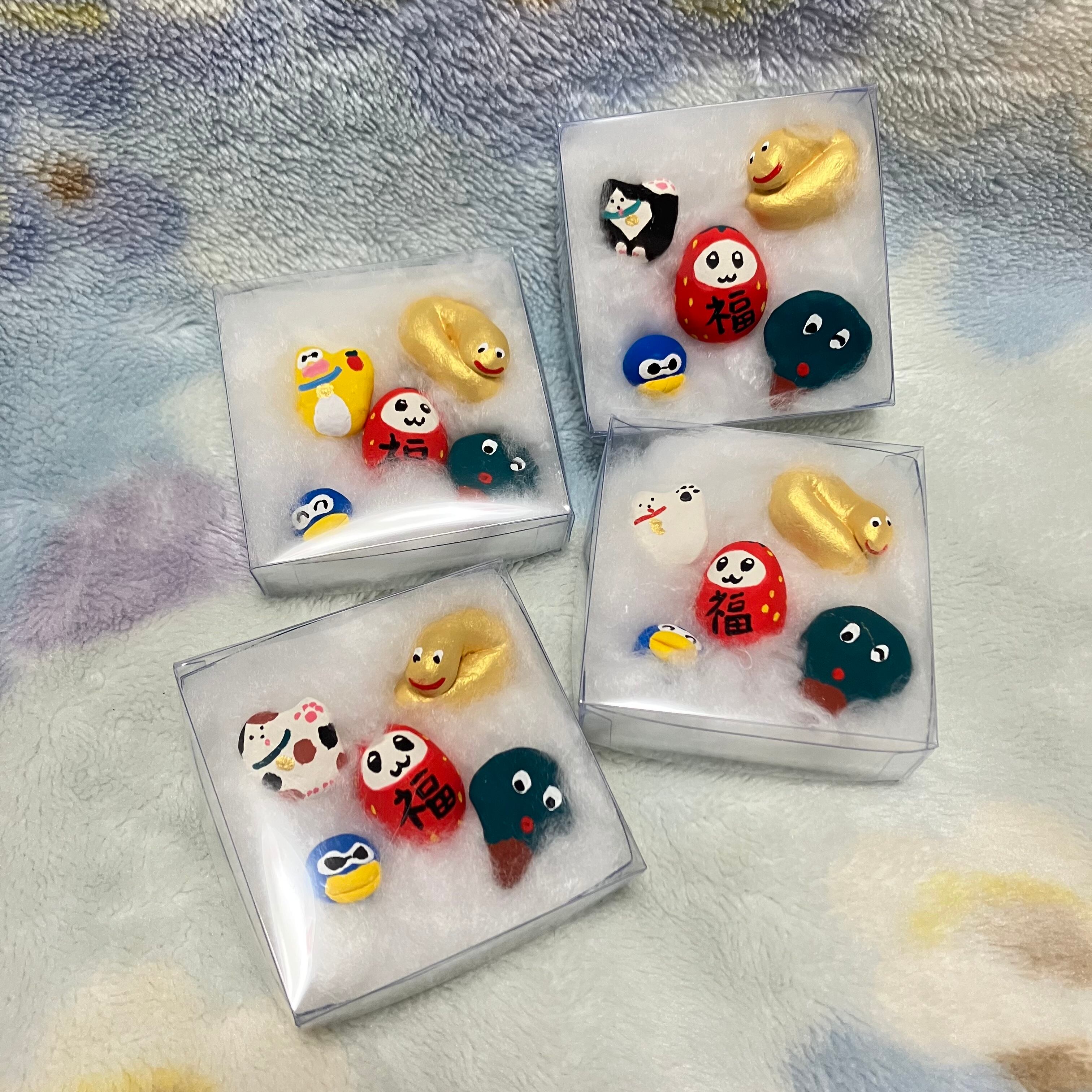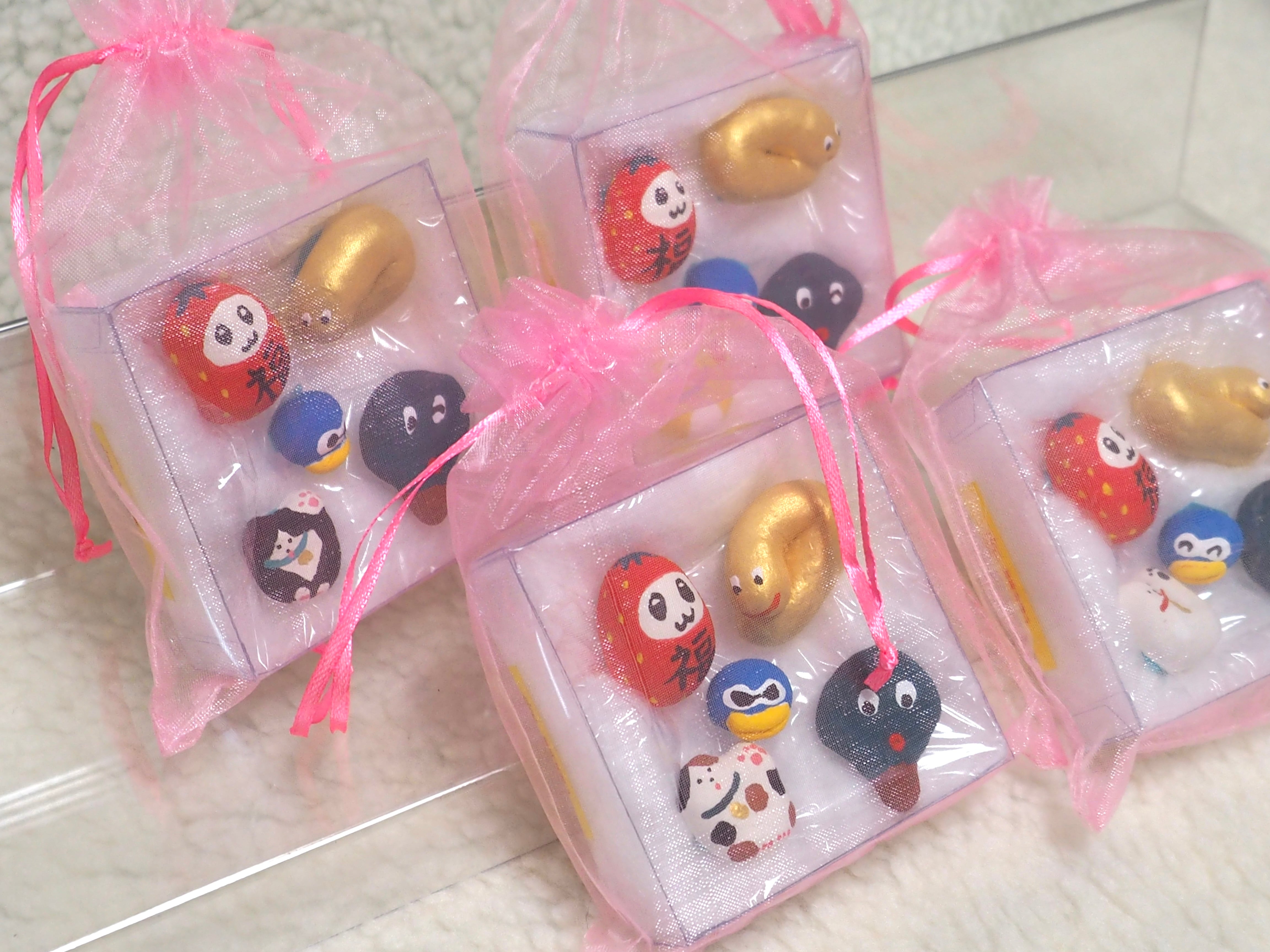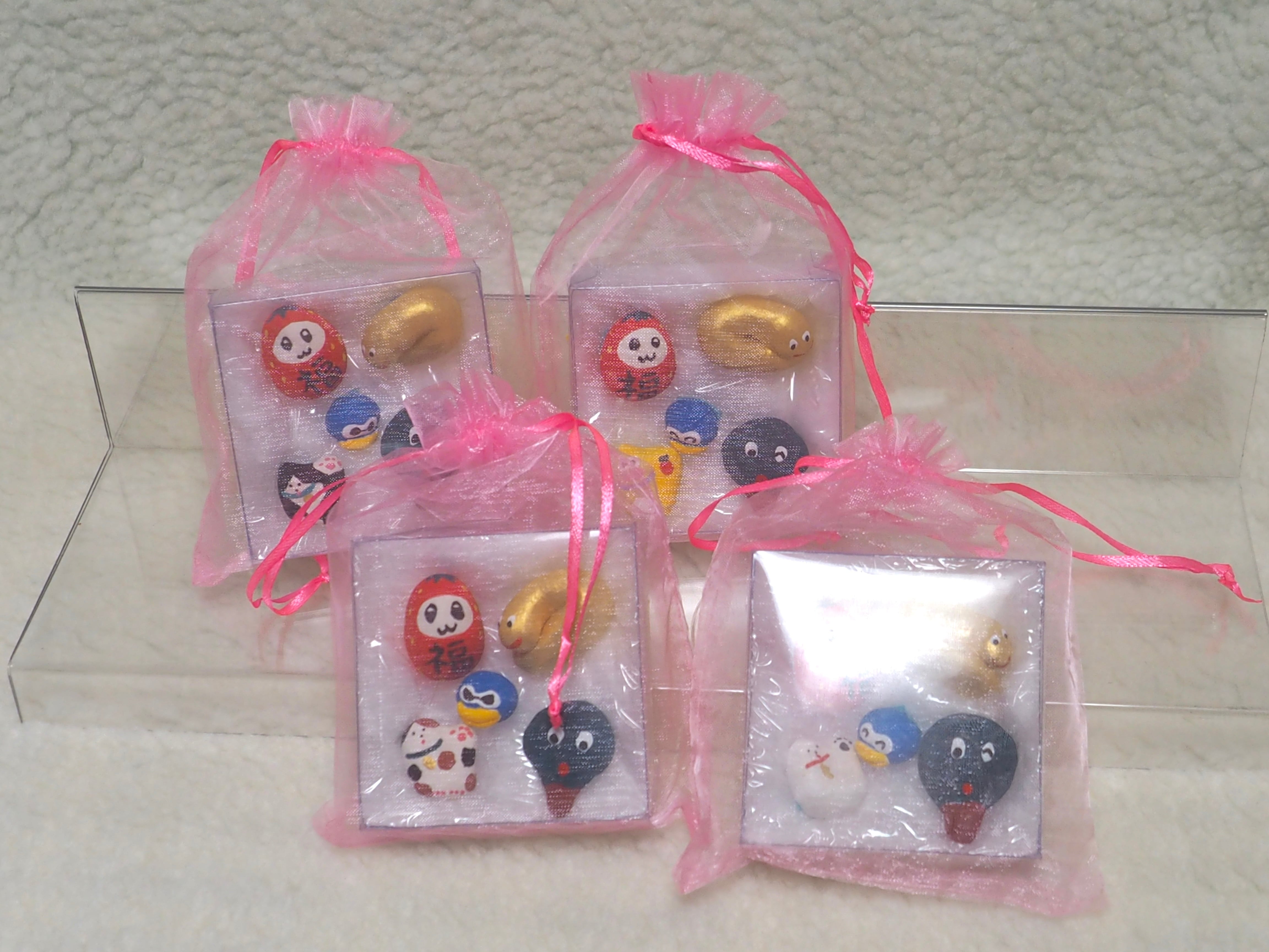 小さな福招きズが入った福セットです。オーガンジー巾着に入ったまま玄関先などに飾るのもおすすめです。あなたのお家に福が来りますように(✭・.・✫)